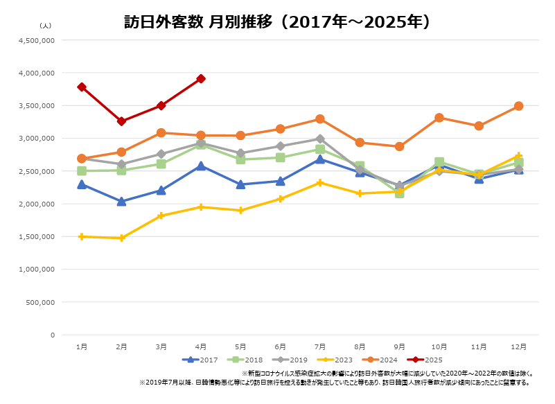 2025年4月には訪日外国人が月間3.91万人と過去最高に達しました。