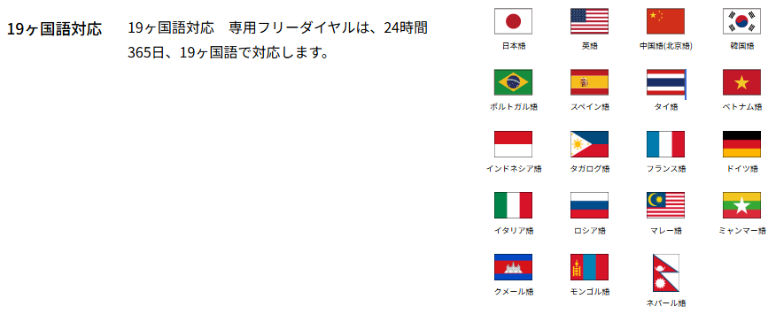 19言語での対応を実現しており、専用フリーダイヤルは24時間365日稼働しています。
